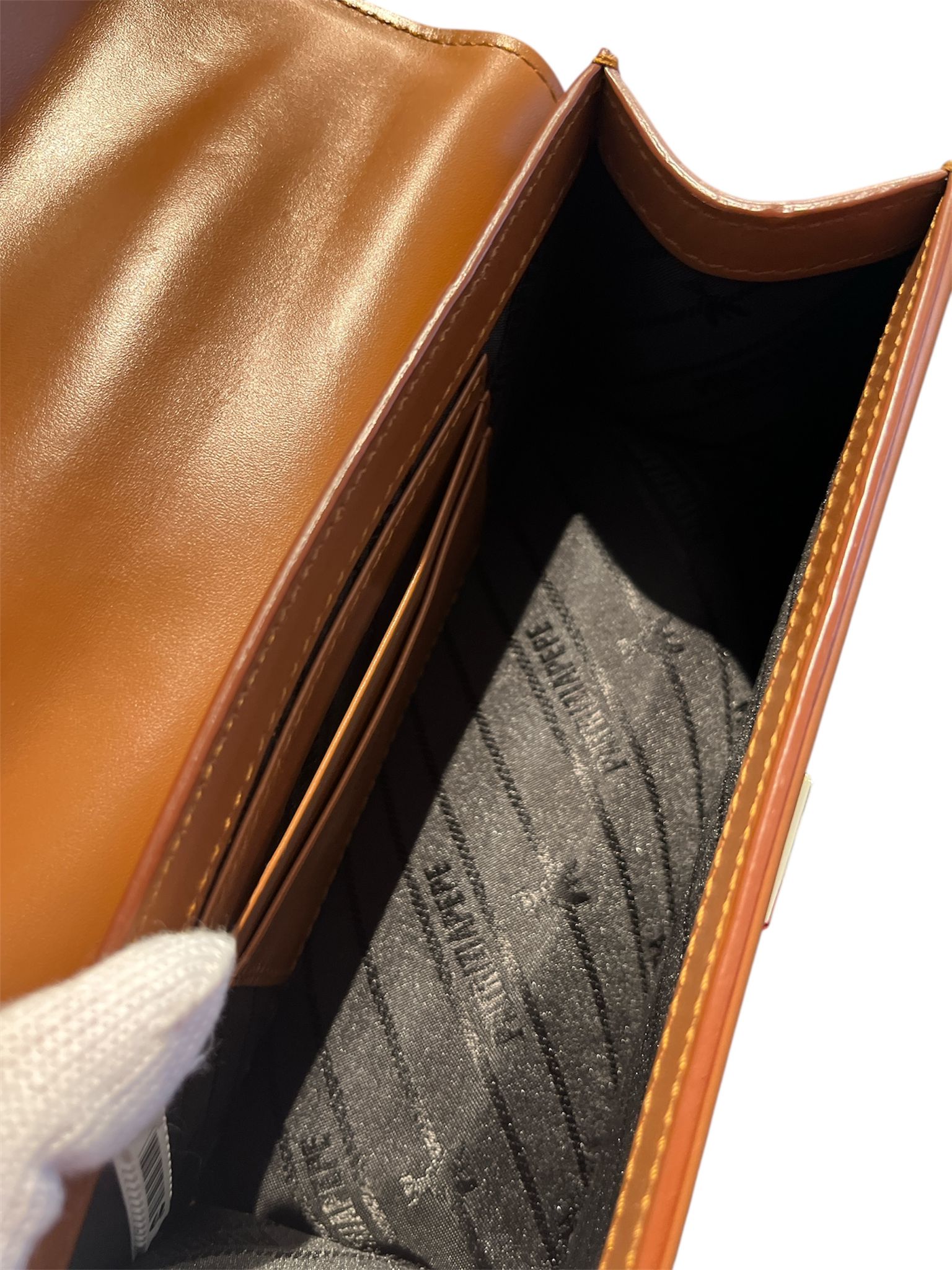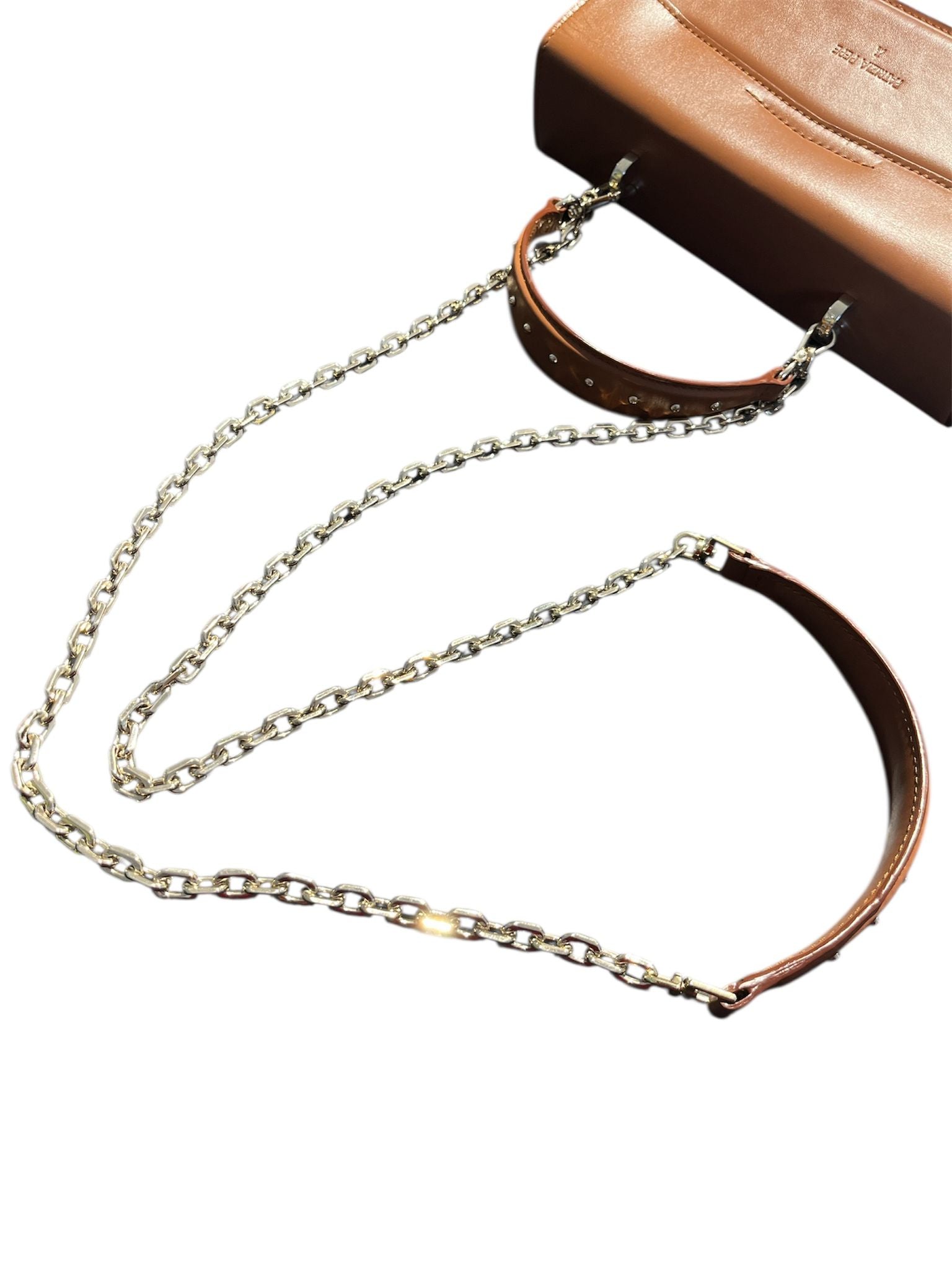 In pelle di vitello liscia pieno fiore, color arancio/cuoio, dotata di tracolla e con metalleria color oro.
