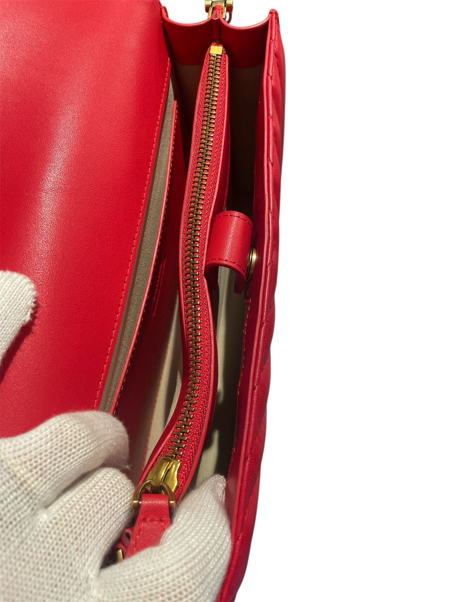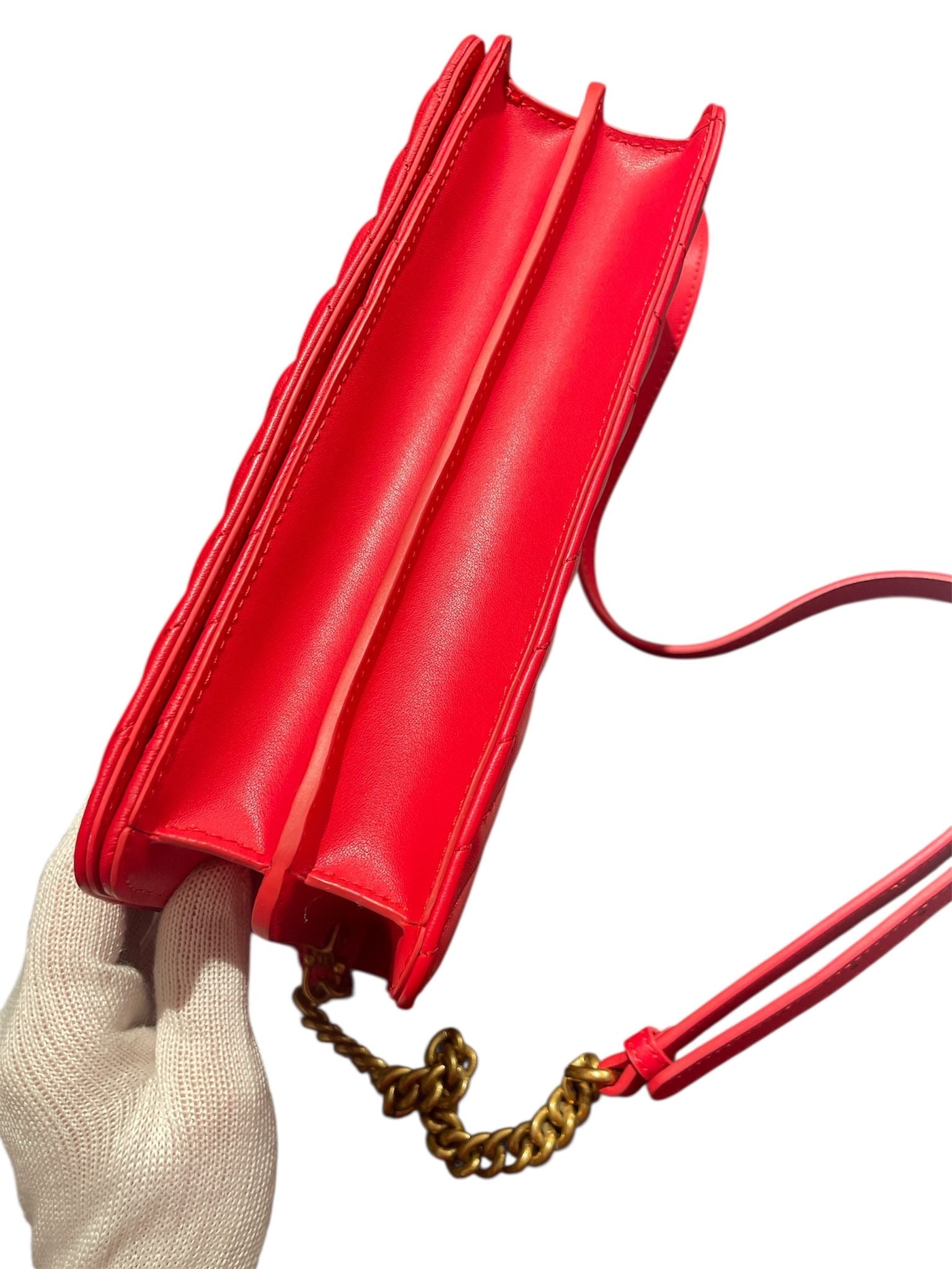 In nappa trapuntata color rosso brillante, con motivo chevron. La chiusura automatica nascosta è completata dall'iconica fibbia in metallo Love Birds Diamond Cut. L'interno è foderato in microfibra e comprende tramezza chiusa con zip e tasca a parete in pelle. La tracolla è lunga 110 cm e combina la catena metallica squadrata al pratico spallaccio regolabile in nappa.