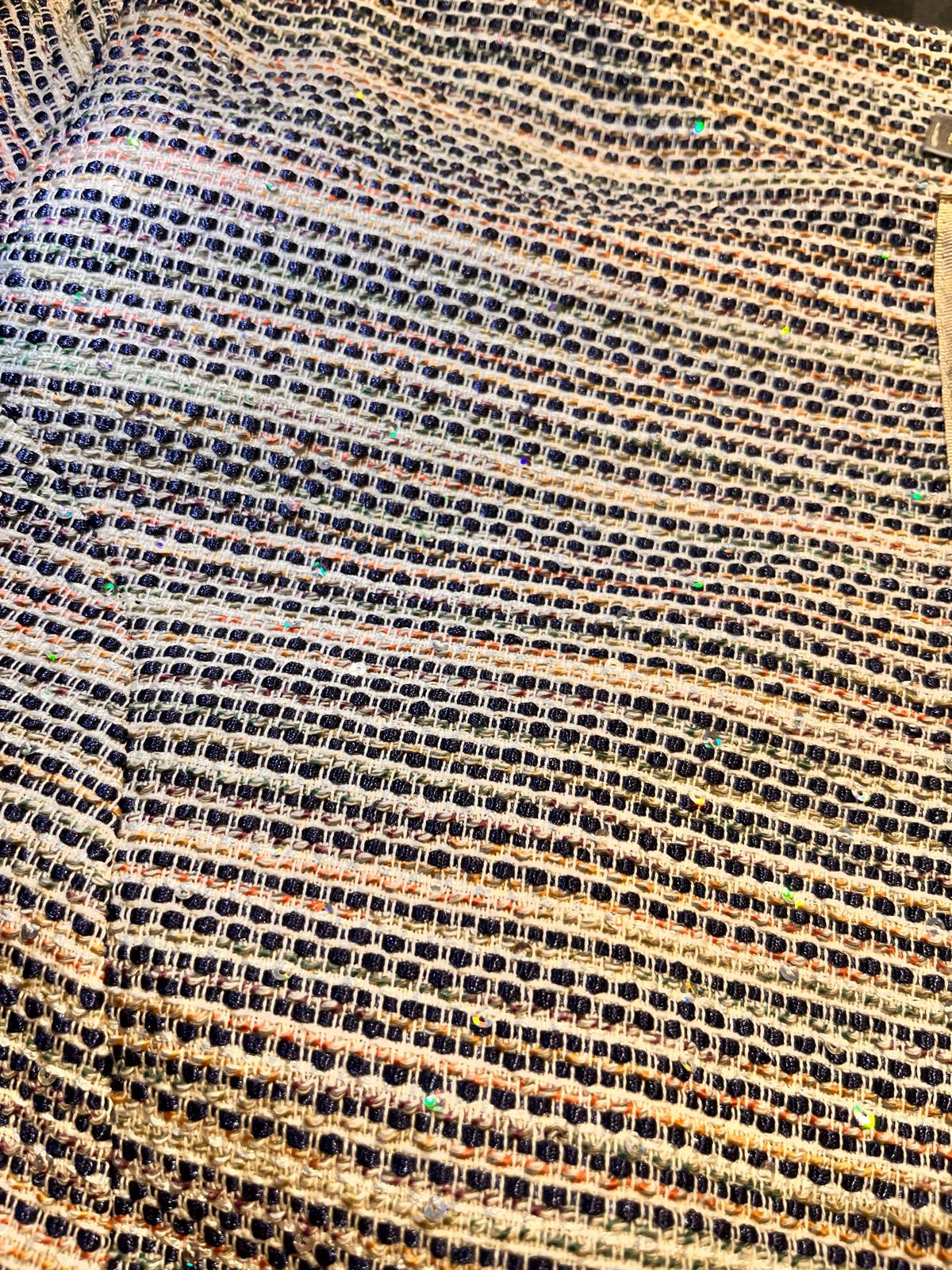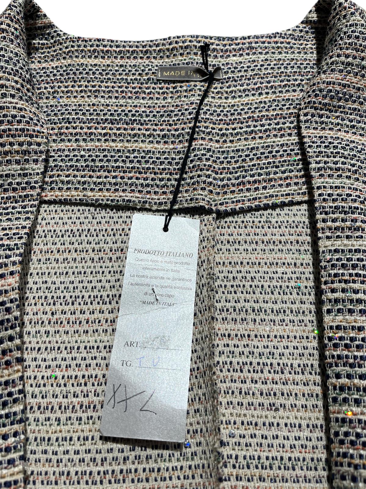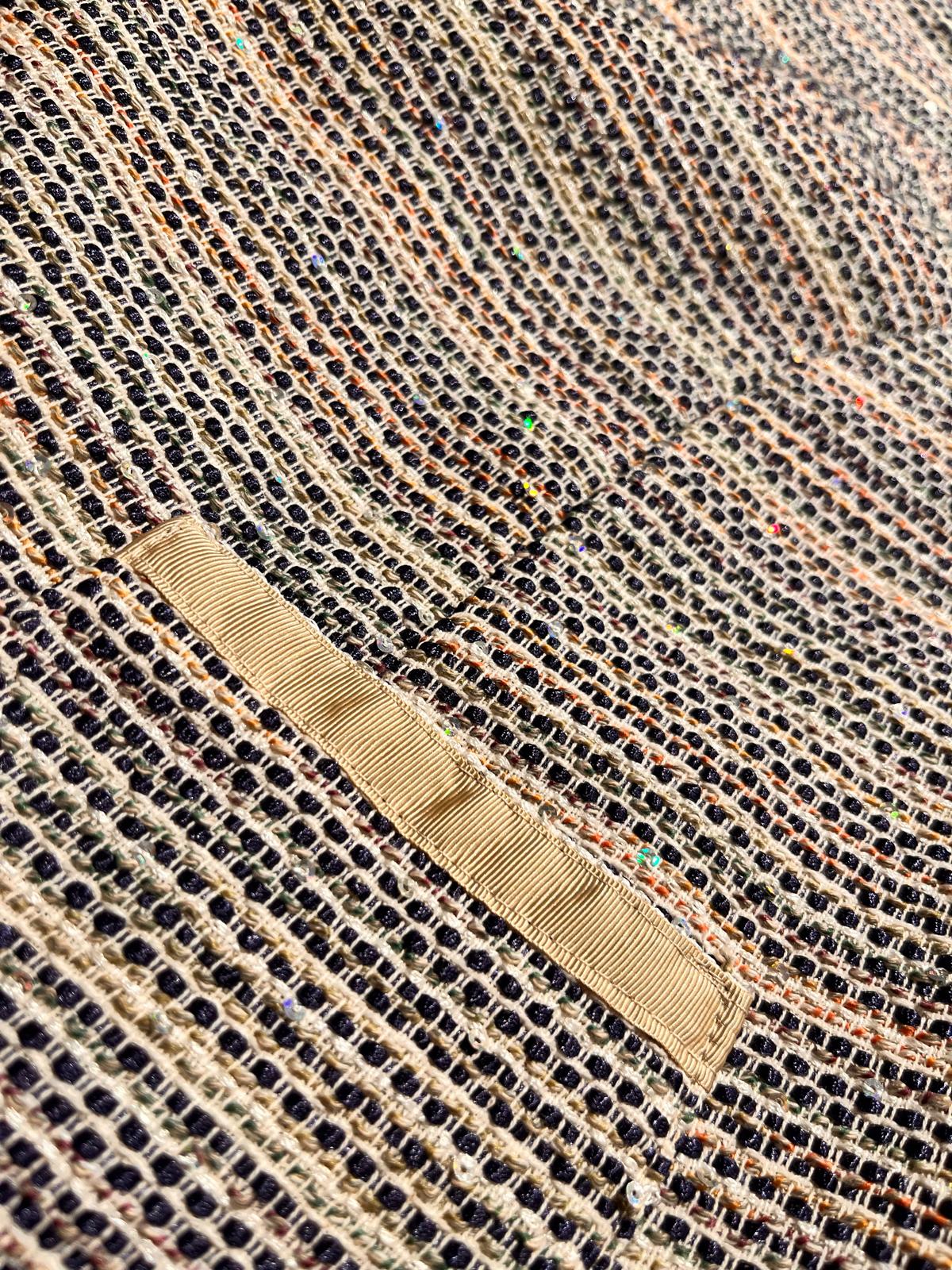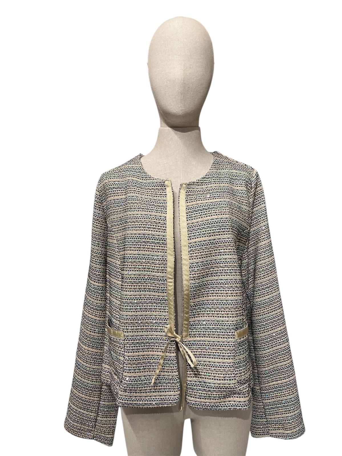 Giacca in tweed multicolore con finiture in nastro dorato.