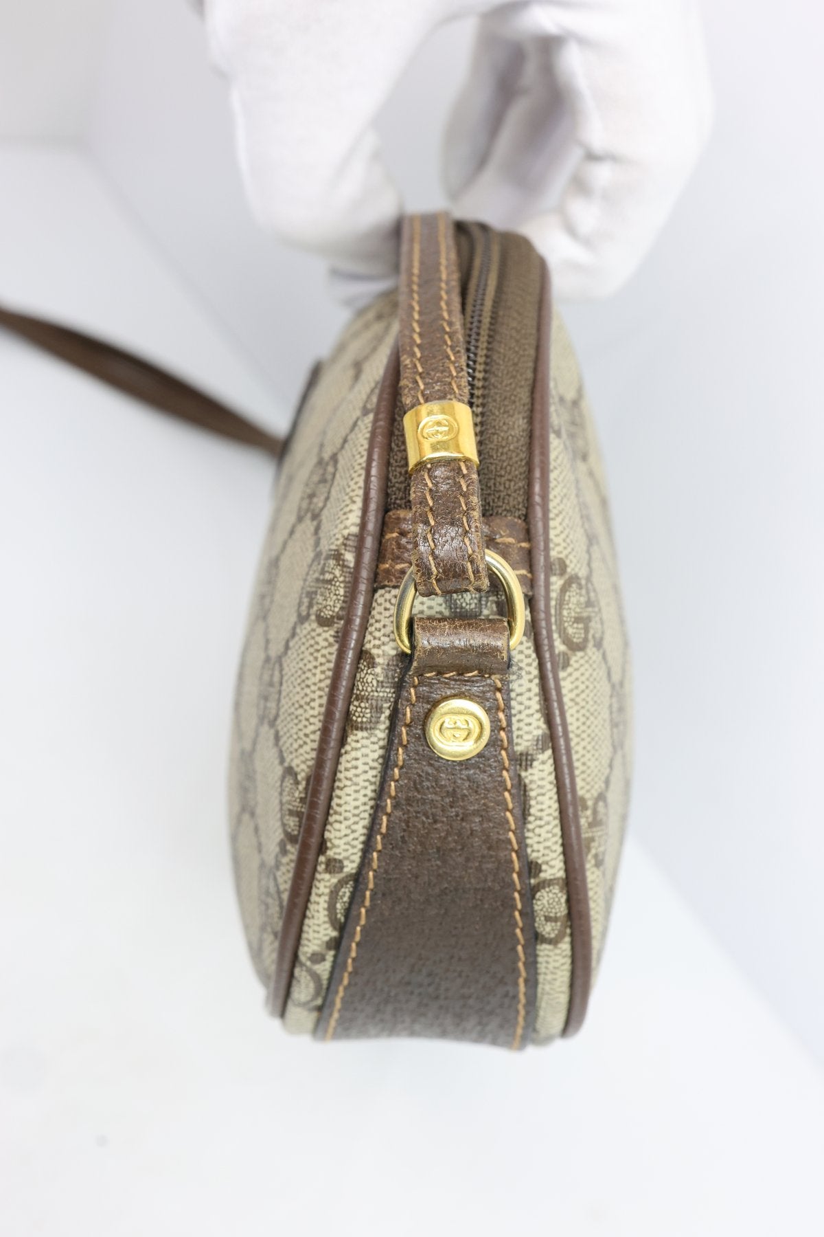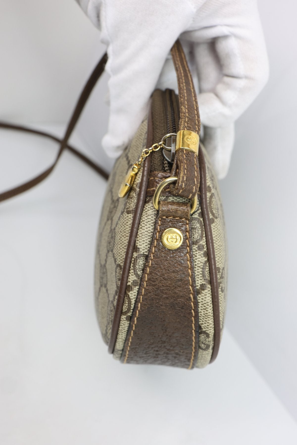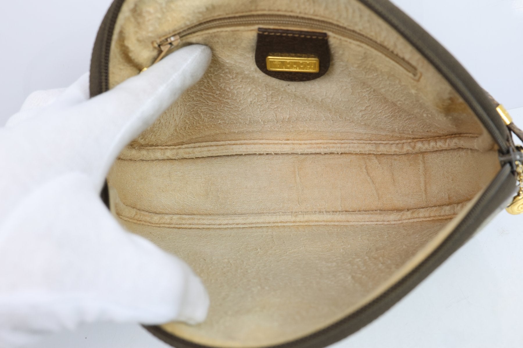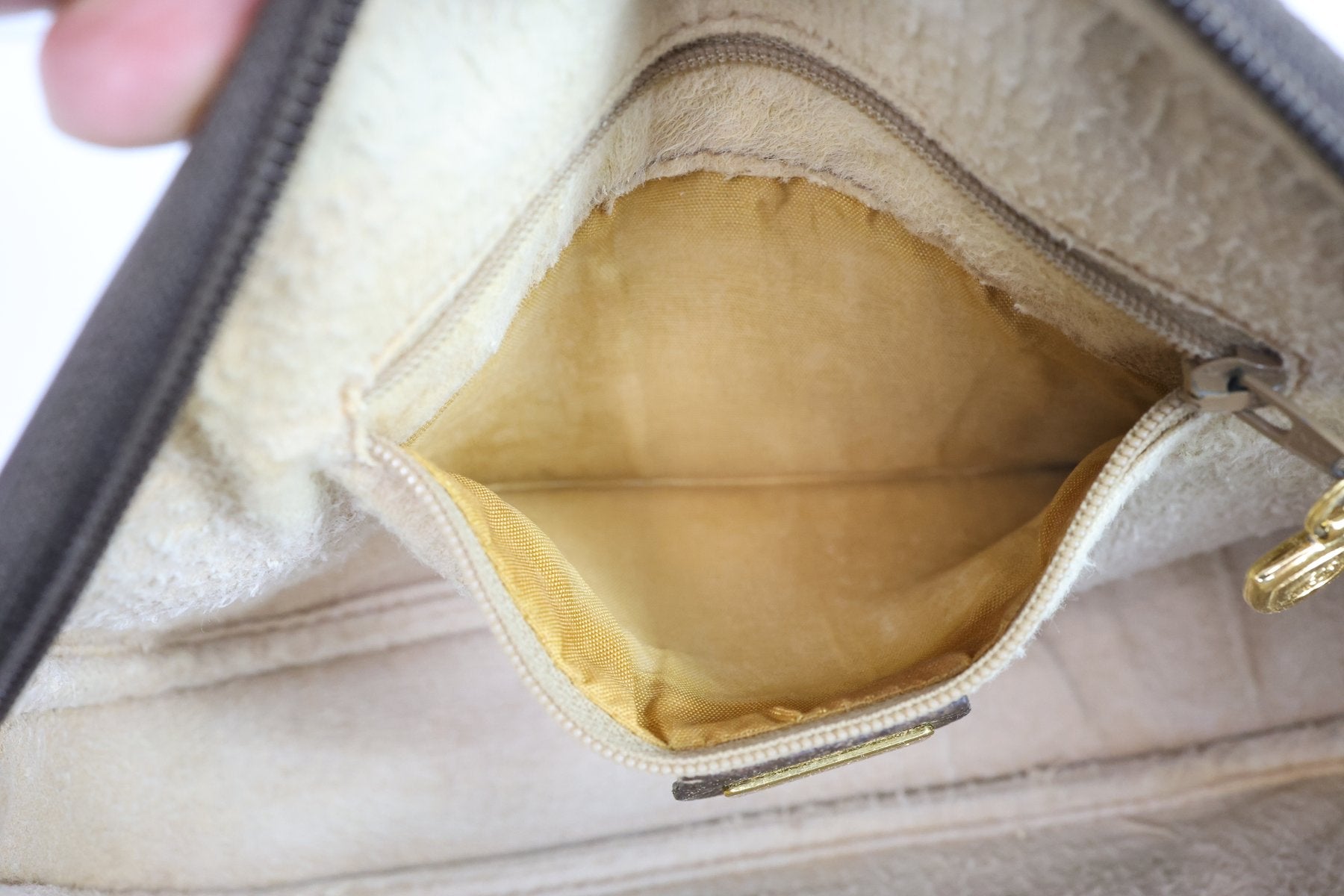 Raffinata borsa retrò molto alla moda e facile da abbinare, con un corpo in tela PVC color beige e finiture in pelle marrone.