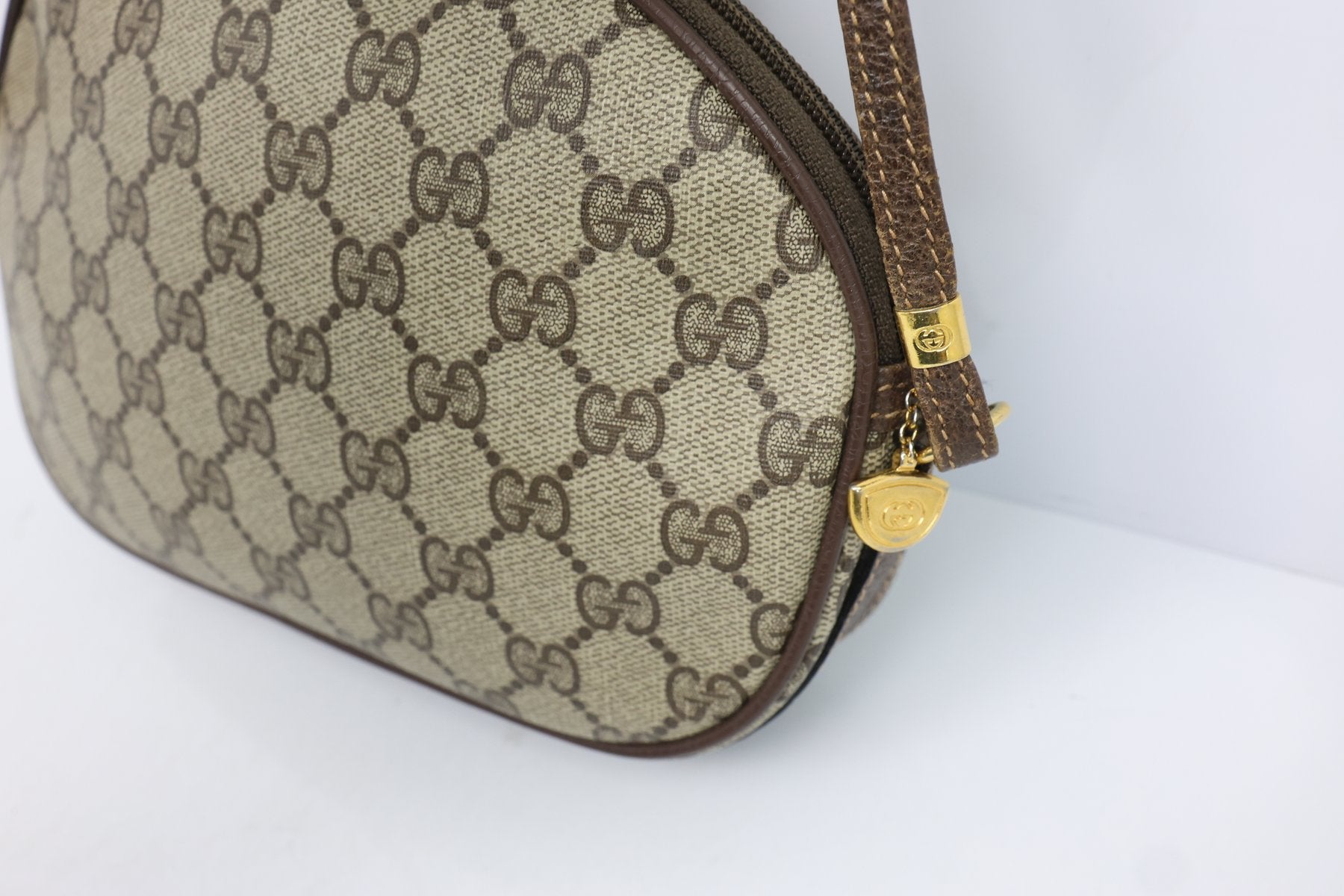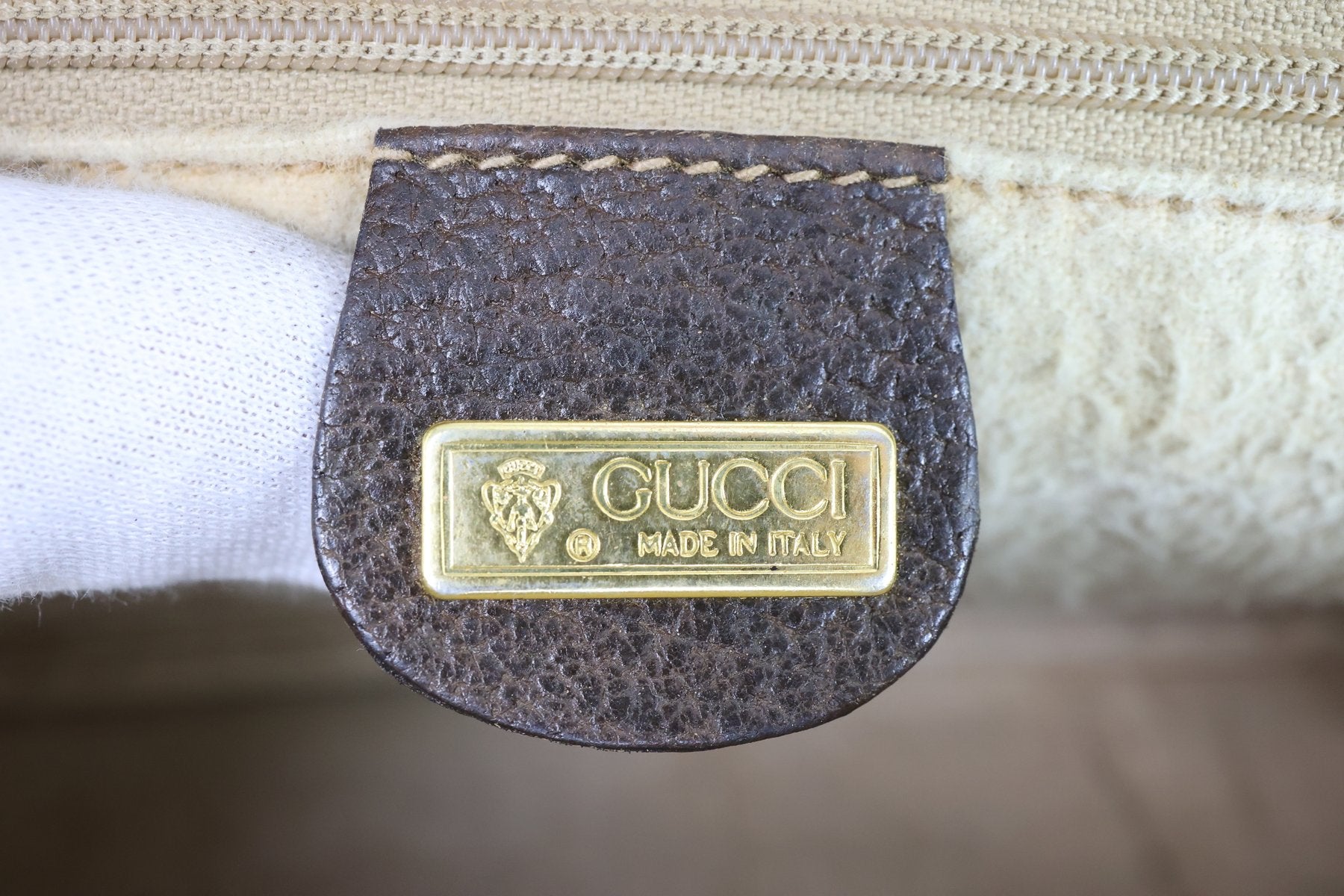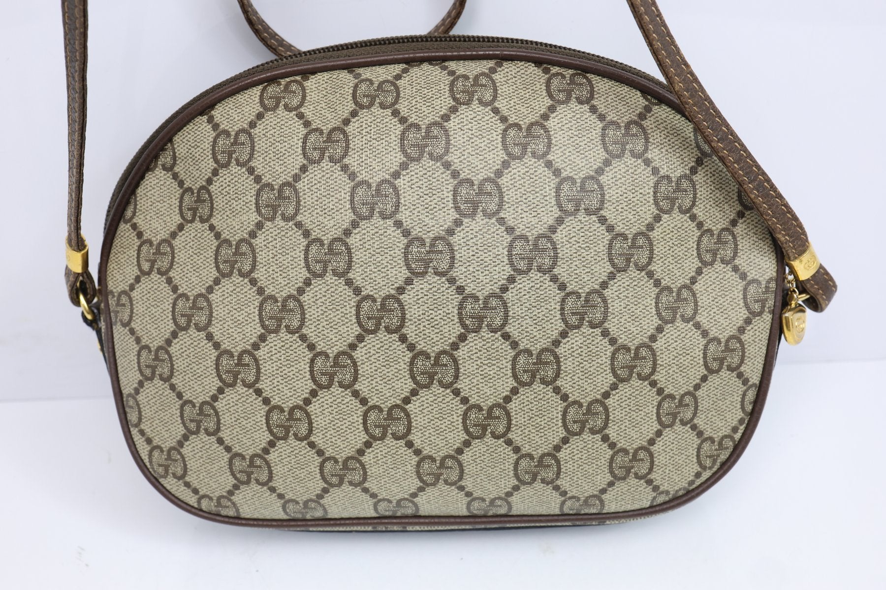 Raffinata borsa retrò molto alla moda e facile da abbinare, con un corpo in tela PVC color beige e finiture in pelle marrone.