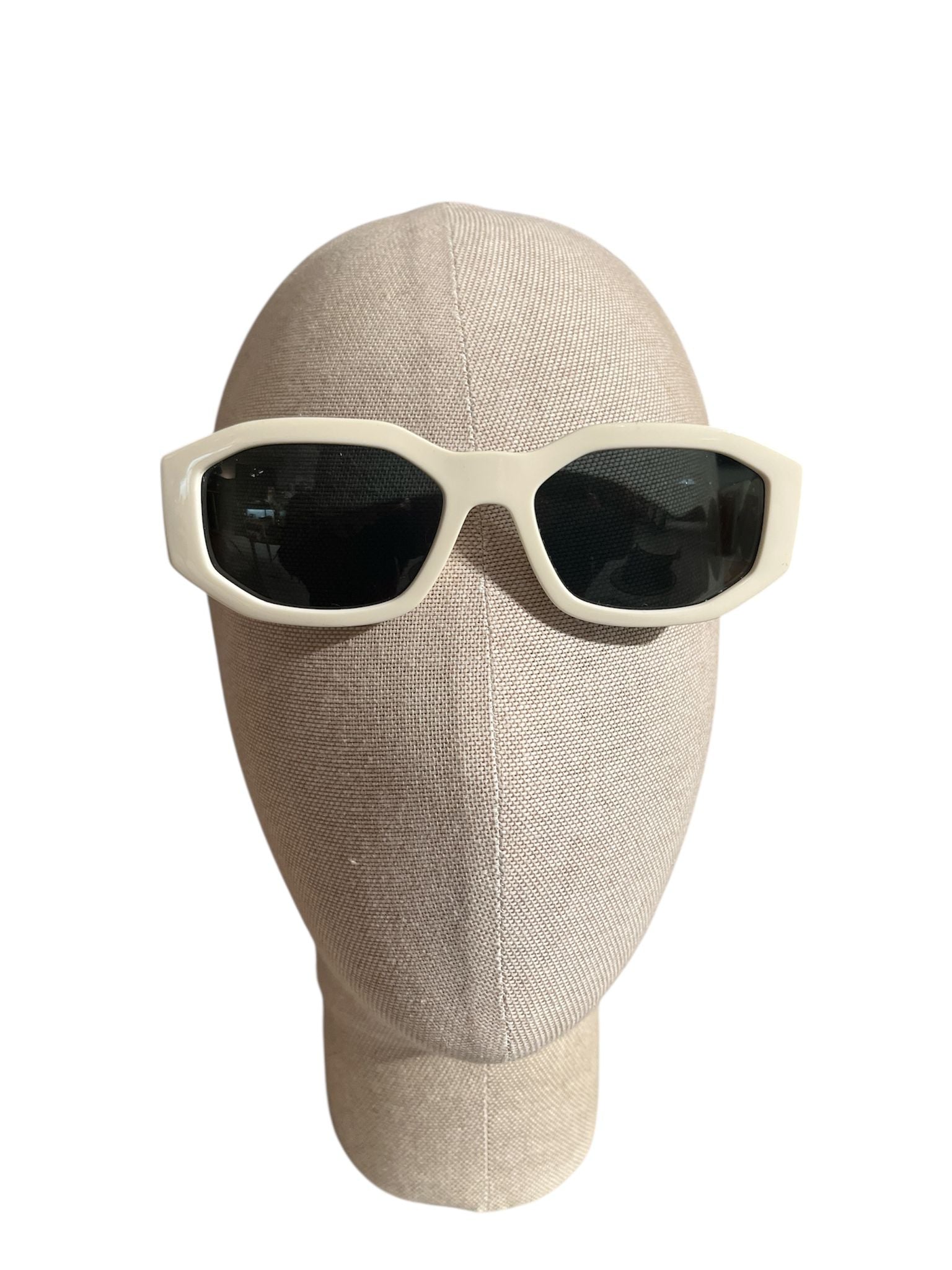 Modello unisex, con montatura in acetato bianco (avorio) e lenti scure.