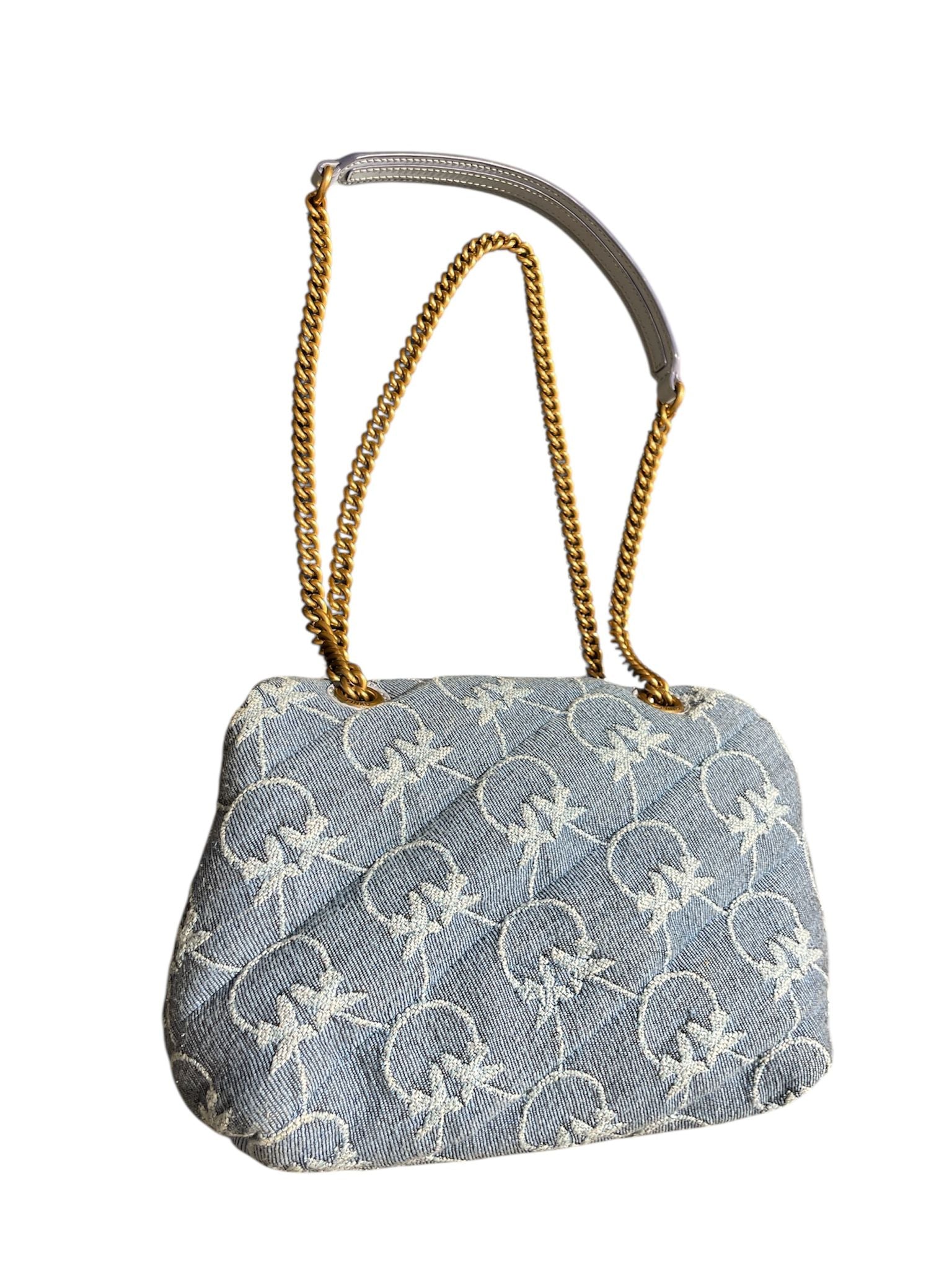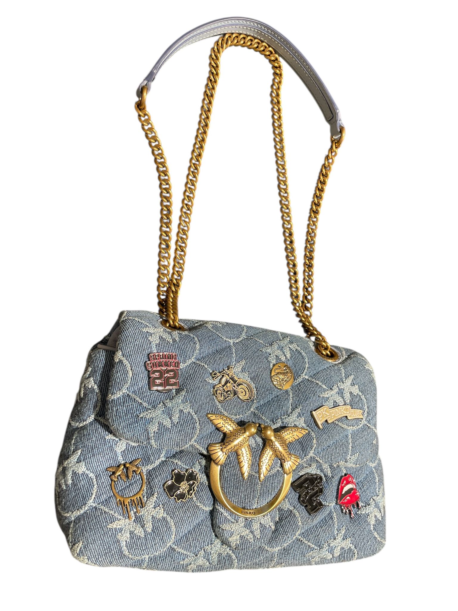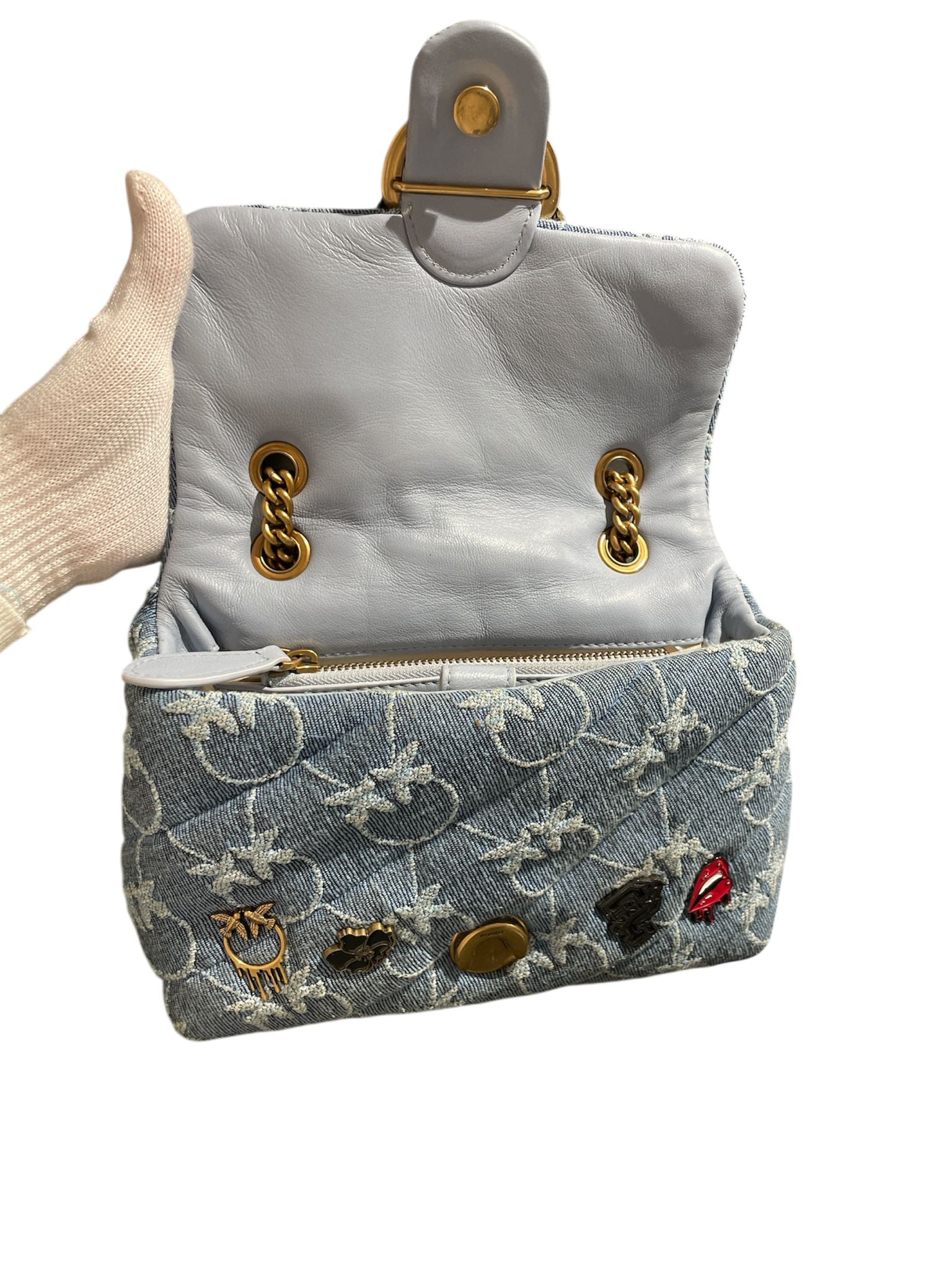 Mini Puff Versity Pins in denim con monogramma e spille, tracolla con catena oro e spallaccio celeste, sul davanti patta con fibbia Love Birds oro e chiusura con bottone automatico, interno in microfibra con tramezza chiusa con zip, tirazip e tasca a parete in pelle.