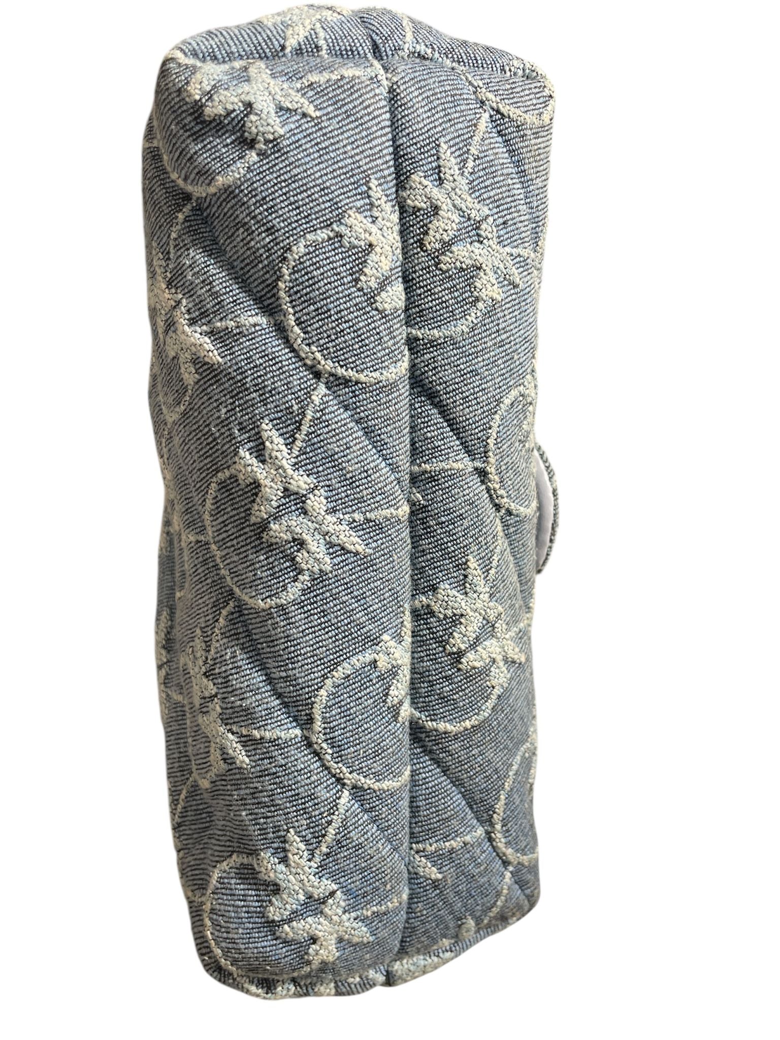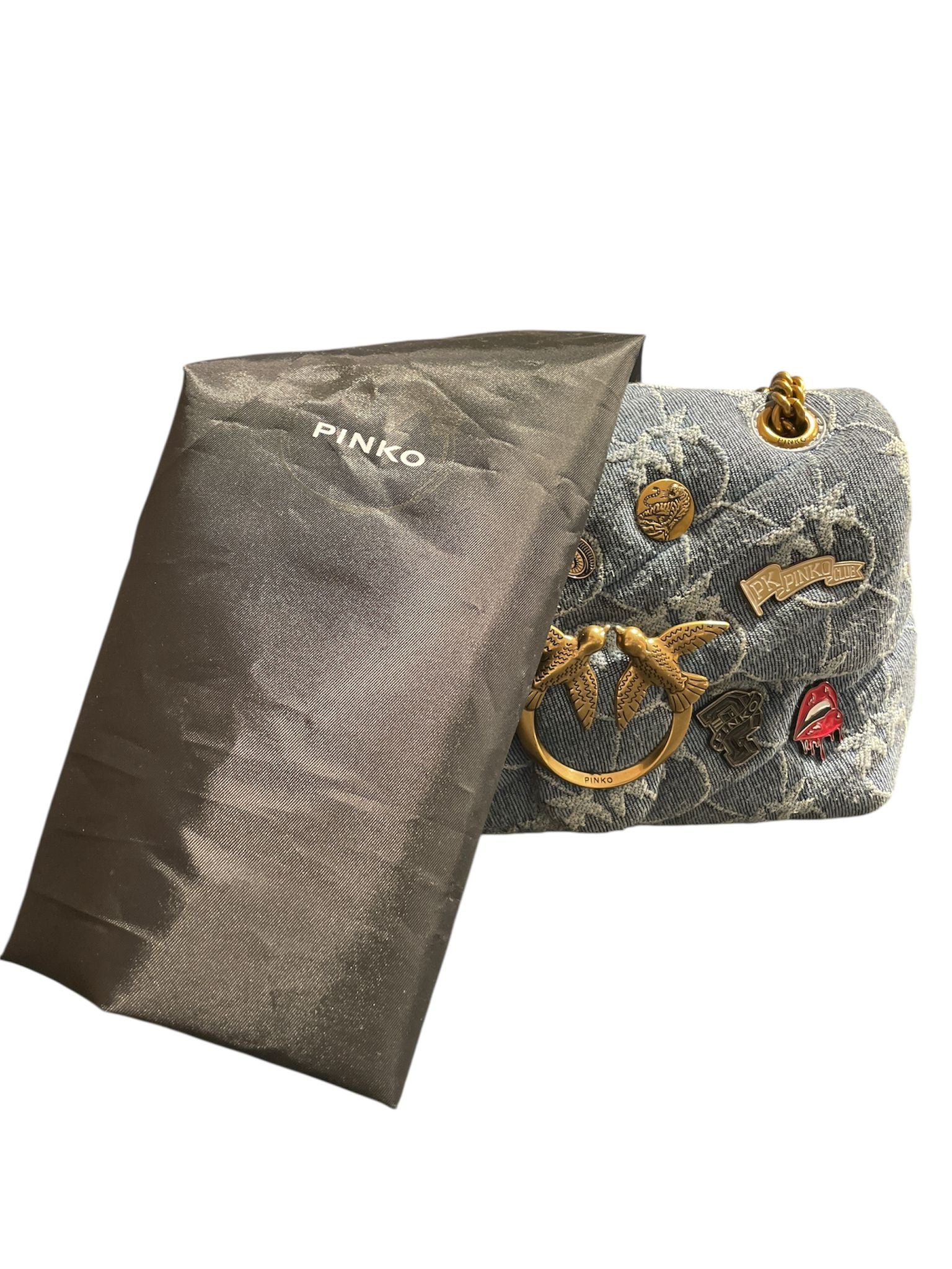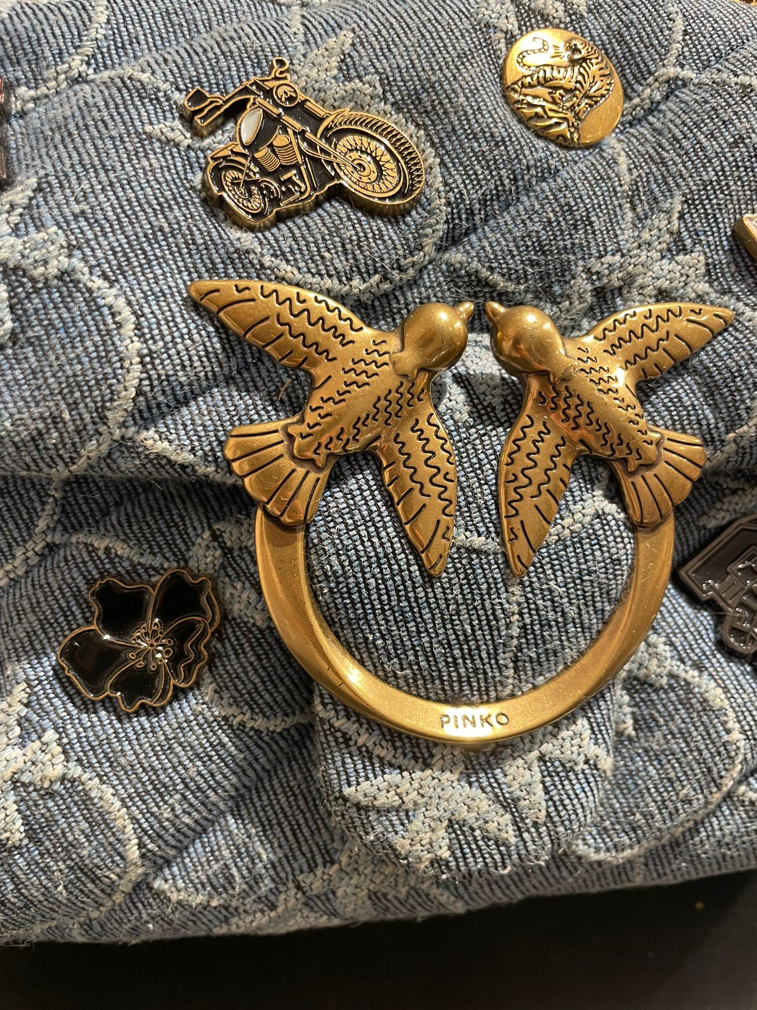 Mini Puff Versity Pins in denim con monogramma e spille, tracolla con catena oro e spallaccio celeste, sul davanti patta con fibbia Love Birds oro e chiusura con bottone automatico, interno in microfibra con tramezza chiusa con zip, tirazip e tasca a parete in pelle.